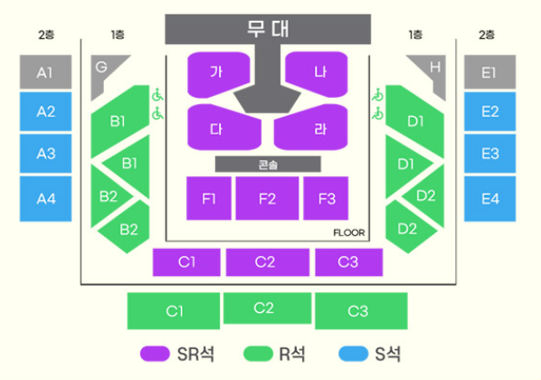 좌석은 일반적으로 VIP석, R석, S석 등으로 구분되며, 일부 구역은 무대 구조에 따라 시야 제한이 발생할 수 있습니다. 예매 시에는 좌석 위치를 반드시 확인하고, 무대와의 거리, 시야 각도를 고려해 선택하는 것이 좋습니다.